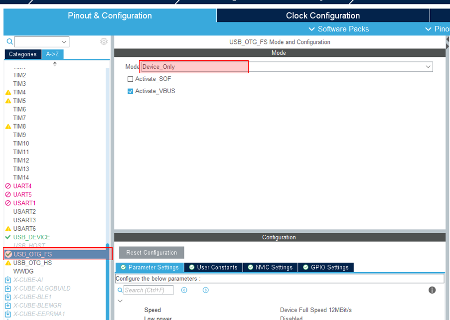 - "Connectivity" → "USB_OTG_FS" → 모드 선택: Device_Only
